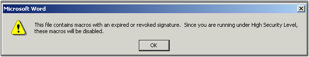 So if I want to be able to edit or revise an S4W file, I have to make my computer volnerable to Word macro viruses. Supposedly the USPTO is working on getting this fixed. Probably it means having the macros re-signed with a new digital signature. Once it is fixed, then we can all change our macro security level back to "high."