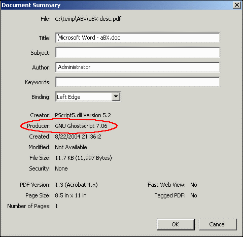 To see this, open a PDF file with Acrobat, and click file/documentproperties/summary. For a patent application that I e-filed recently, such PDF files list a "creator" of "pscript5.dll version 5.2" and a "producer" of "gnu ghostscript 7.06". You can see this in the "document summary" in the figure at right. |
